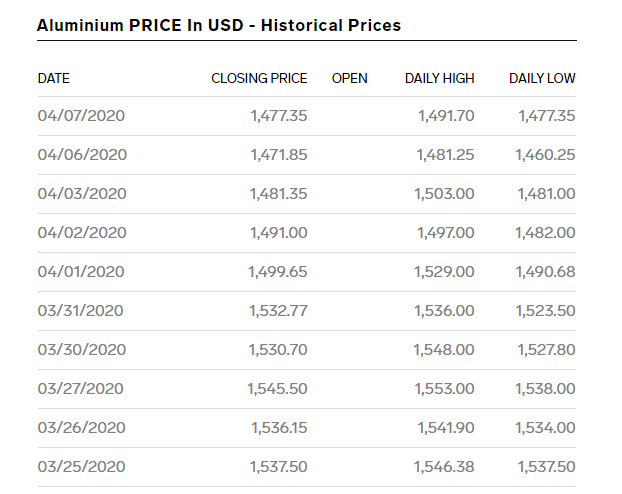 According to Reuters, following the worrying employment data in the United States, metals, copper and aluminum all fell due to demand concerns. The Financial Times also published an article “The aluminum industry is facing a huge supply glut”. The global metal industry seems to have reached a trough. On April 6, 2020, the global aluminum quotation fell below the 2016 trough, with a daily minimum transaction price of 1460.25 USD / ton.